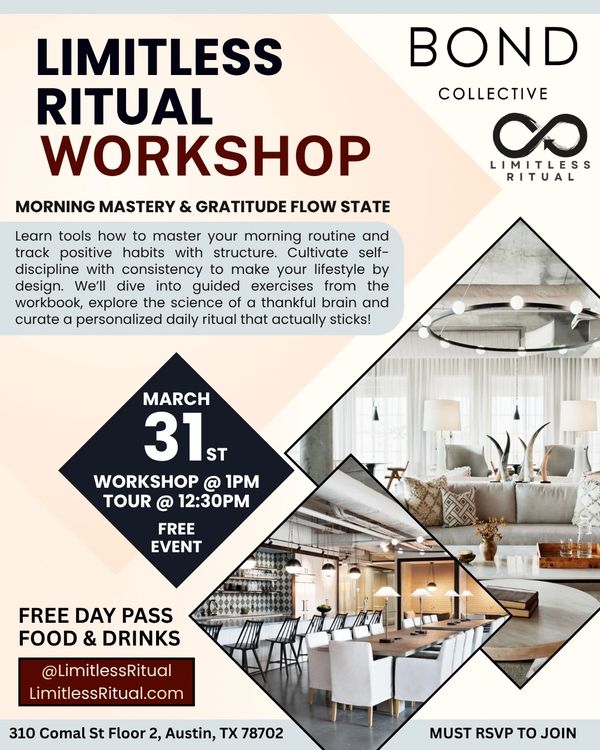 You will walk away with a fresh outlook and a concrete plan to elevate your everyday life by understanding the neurobiology of gratitude. Learn the proven successful framework using Limitless Ritual as a morning routine to enter massive flow state. Join us at Bond Collective in Austin, Texas for this interactive workshop led by the founder and author Justin Stearman.